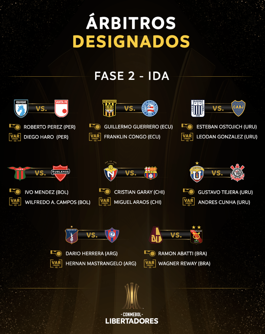 La Comisión de Árbitros de la CONMEBOL confirmó a los árbitros designados para los partidos de ida de la fase 2 de la Copa Libertadores. Esta es la terna arbitral encargada de dirigir el duelo entre los equipos ecuatorianos: