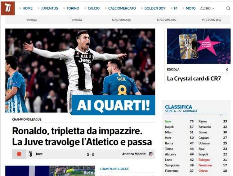 Para los 85′, Cristiano Ronaldo consiguió su triplete vía penal, con este triunfo el equipo italiano pasa a cuartos de la Champion League.