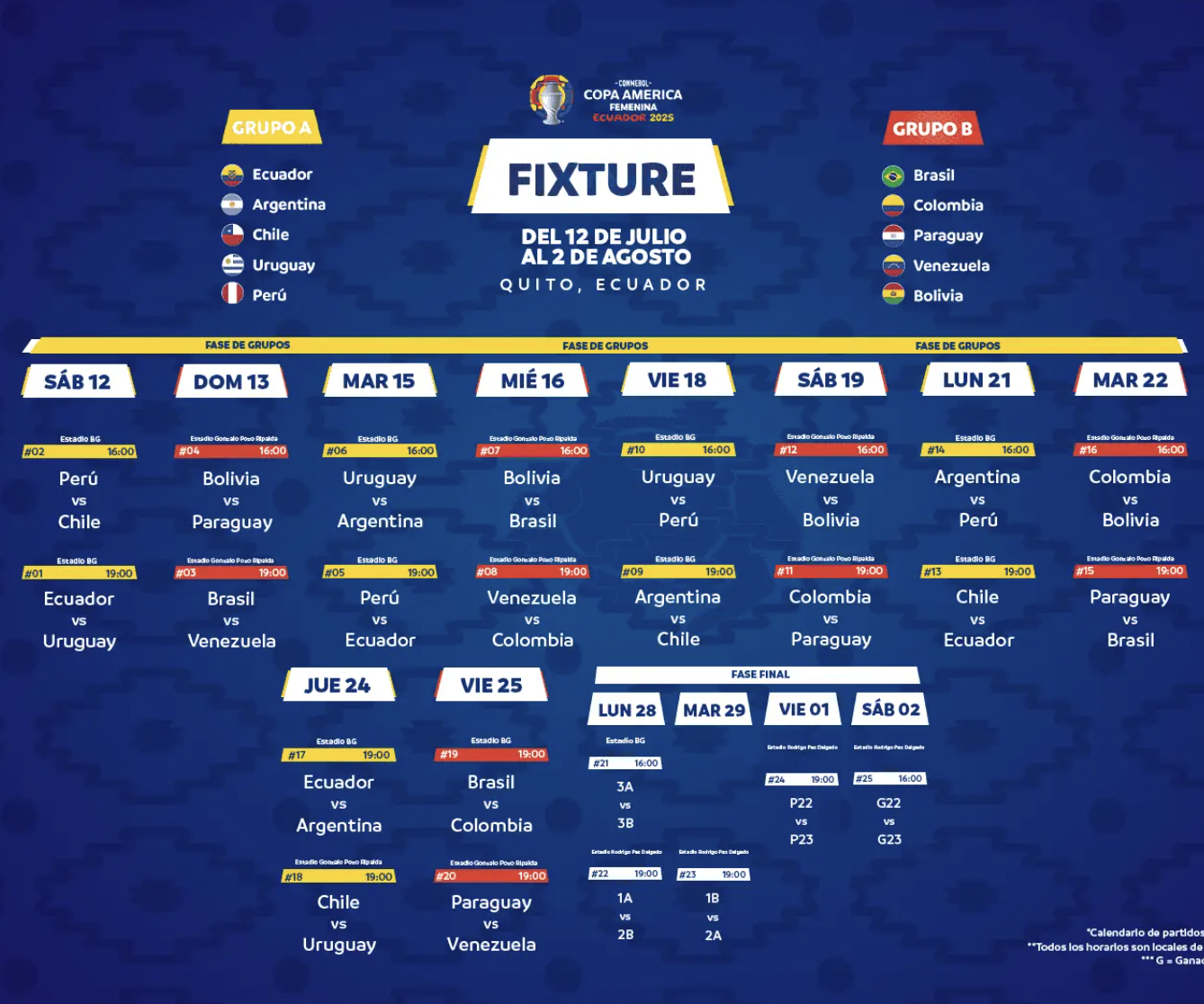 Aunque todos los encuentros se desarrollarán en Quito, habrá tres escenarios protagonistas. El Estadio Banco Guayaquil recibirá 11 partidos, incluido el inaugural entre Perú y Chile. Por su parte, el Estadio Gonzalo Pozo Ripalda albergará otros 10 encuentros de la primera fase. Finalmente, el Estadio Rodrigo Paz Delgado será sede de las semifinales, el partido por el tercer puesto y la gran final, prevista para el sábado 2 de agosto a las 19:00.