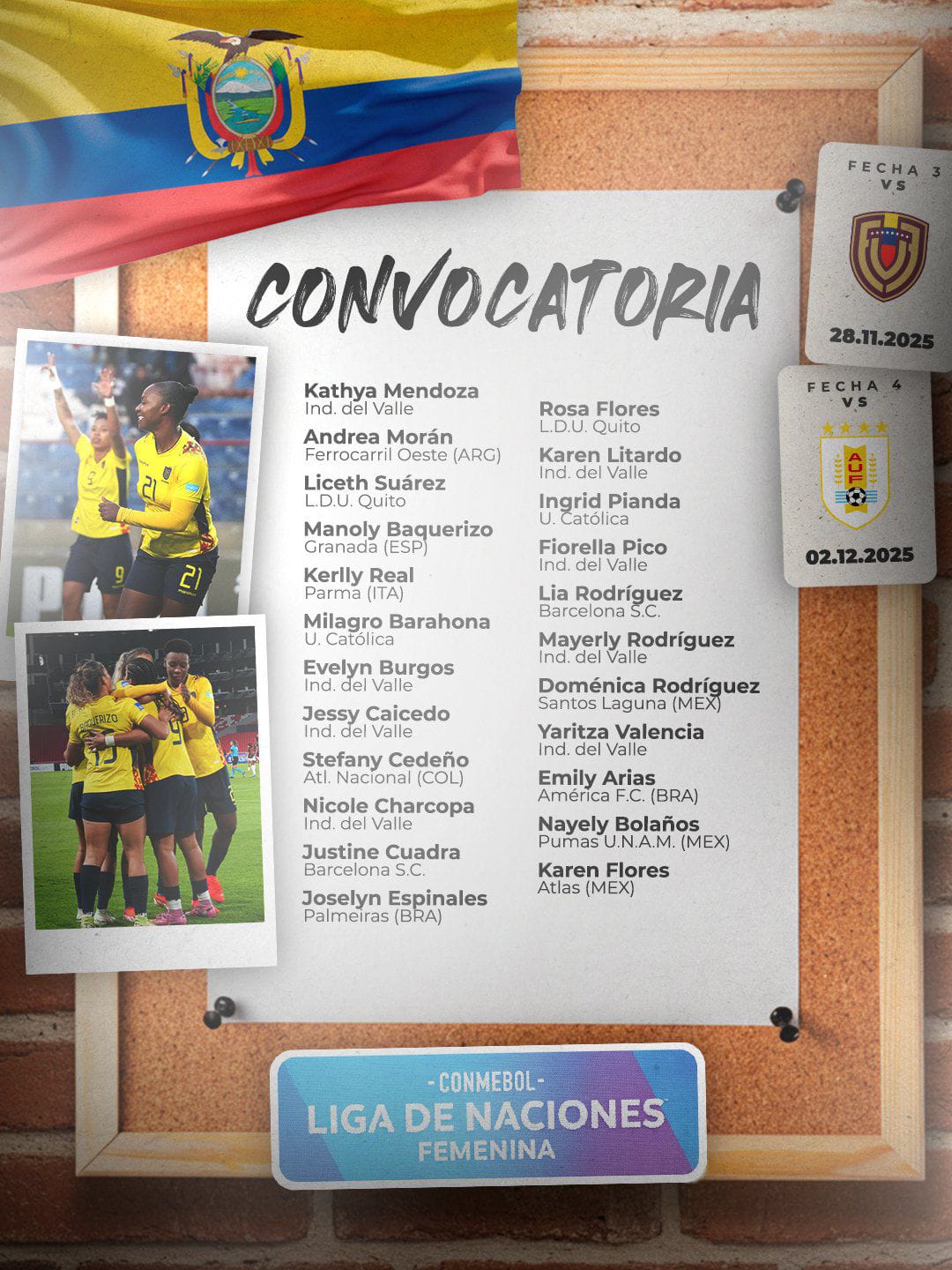 La Selección Ecuatoriana Femenina presentó la nómina de jugadoras convocadas para afrontar una nueva ventana de la CONMEBOL Liga de Naciones, donde deberá medirse ante Venezuela el 28 de noviembre y frente a Uruguay el próximo 2 de diciembre.