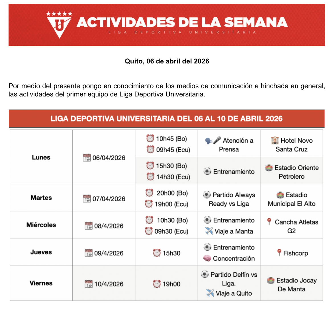 En su planificación, el club universitario atenderá a la prensa este lunes 6 de abril a las 09:45 (hora de Ecuador). Más tarde, el equipo entrenará en el estadio de Oriente Petrolero para ultimar detalles del encuentro.