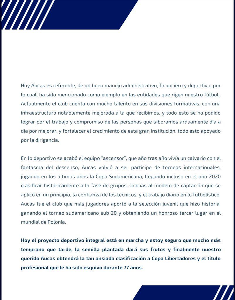 Finalmente, el ex dirigente aclara que deposita su confianza en el equipo, cuyos objetivos principales continúan siendo la participación en Copa Libertadores y el título nacional.