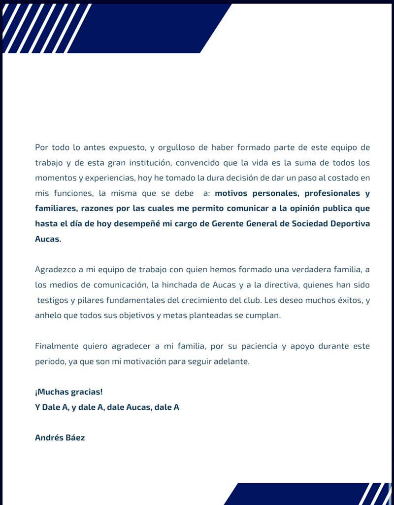 Este jueves, Andrés Báez finalizó su período en la dirigencia de Sociedad Deportivas Aucas. El directivo emitió un comunicado en sus redes sociales en el que da por terminado su paso en el elenco oriental.