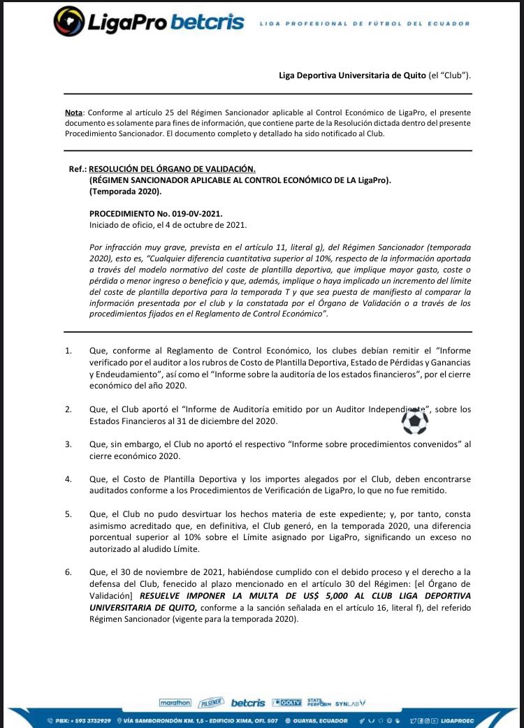 Por un lado, el escrito detalla que Liga no entregó el “Informe sobre procedimiento convenidos”. Además, el elenco azucena no remitió el documento en donde se especifica el costo de la plantilla 2020.