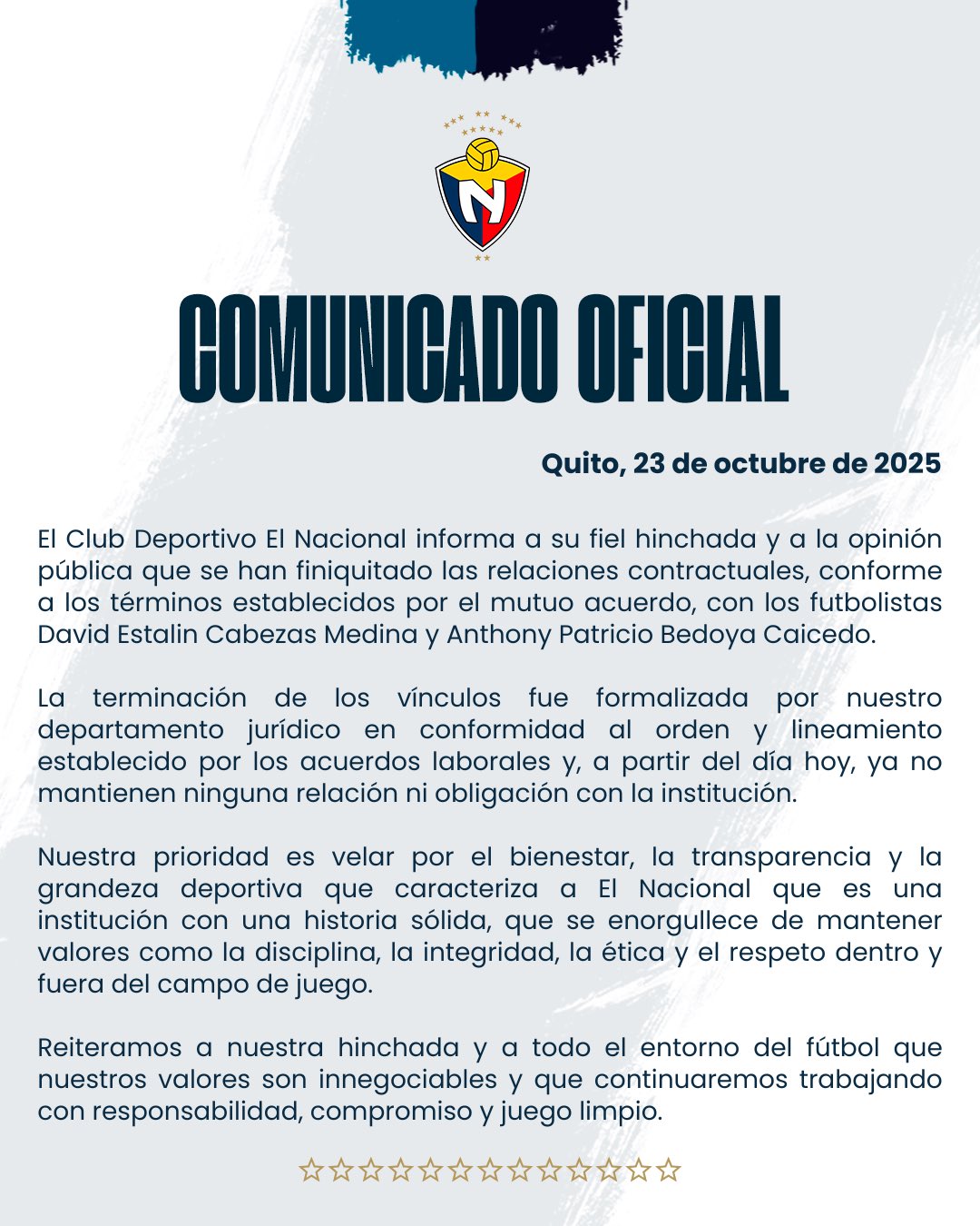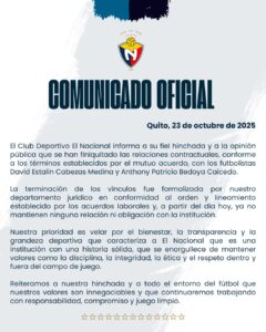 El Club Deportivo El Nacional informó este jueves que los futbolistas David Cabezas y Anthony Bedoya finalizaron sus contratos con la institución tras llegar a un acuerdo mutuo. Según el club, ambos jugadores ya no mantienen ninguna obligación contractual con la entidad.