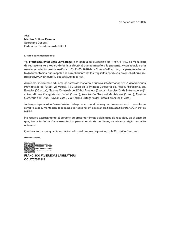 La Fédération Internationale de Football Association (FIFA) y la Confederación Sudamericana de Fútbol (CONMEBOL) emitieron un comunicado para aclarar que la etapa 2019-2023 no se contabiliza dentro del límite de mandatos, lo que abre la puerta para que Francisco Egas pueda postularse al período 2027-2031 al mando de la Federación Ecuatoriana de Fútbol (FEF).