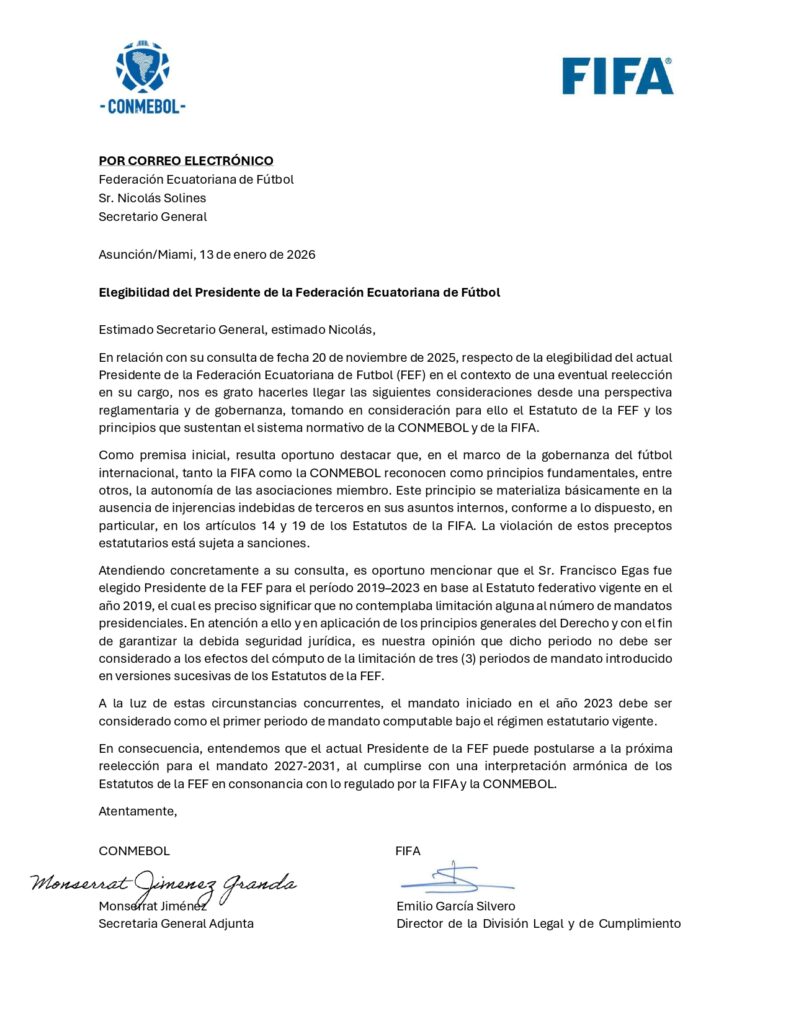 La Fédération Internationale de Football Association (FIFA) y la Confederación Sudamericana de Fútbol (CONMEBOL) emitieron un comunicado para aclarar que la etapa 2019-2023 no se contabiliza dentro del límite de mandatos, lo que abre la puerta para que Francisco Egas pueda postularse al período 2027-2031 al mando de la Federación Ecuatoriana de Fútbol (FEF).