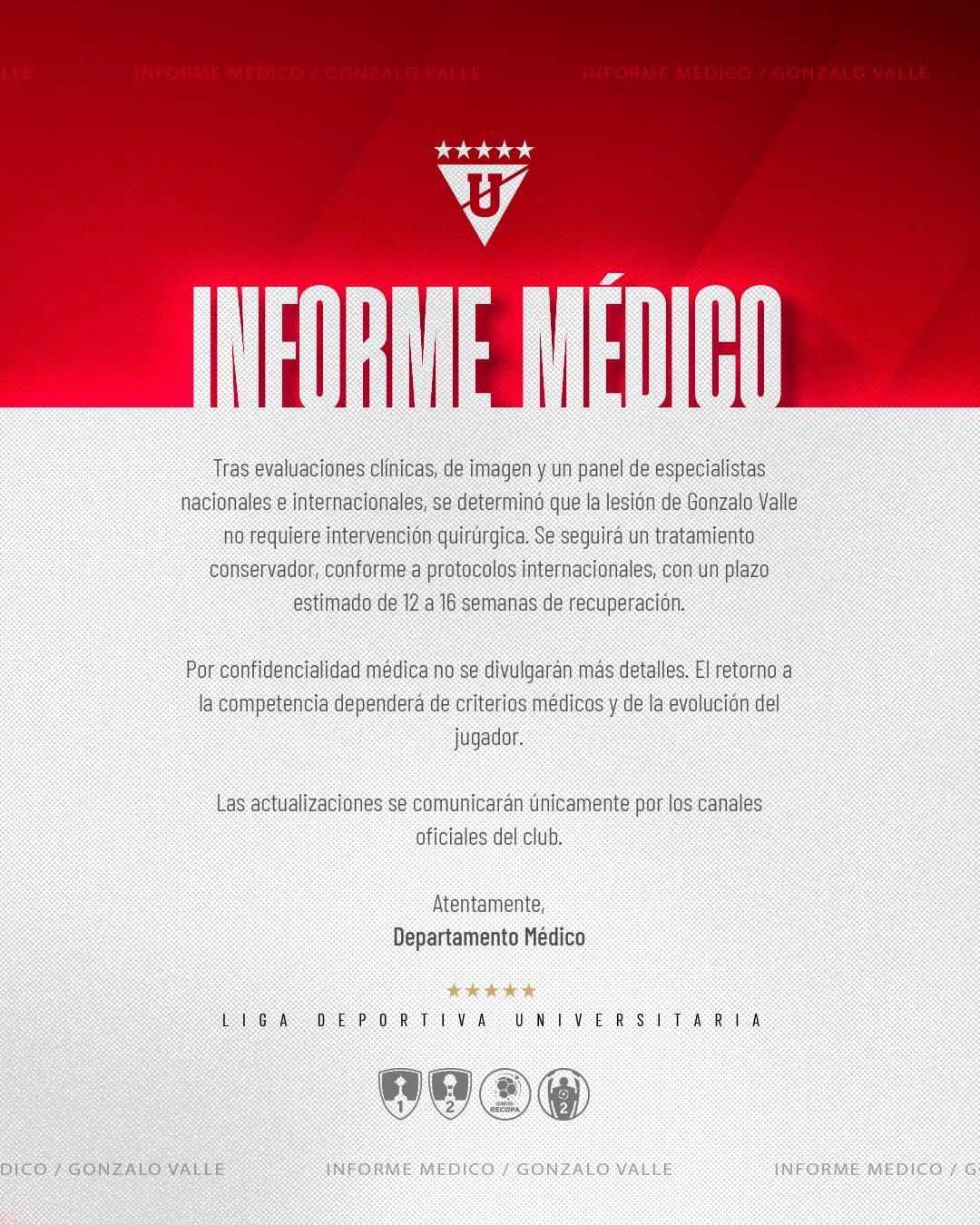 Liga Deportiva Universitaria informó oficialmente sobre el estado de salud de su arquero Gonzalo Valle. Según las evaluaciones médicas, la lesión del guardameta no requiere intervención quirúrgica y seguirá un tratamiento conservador, cumpliendo con los protocolos internacionales.