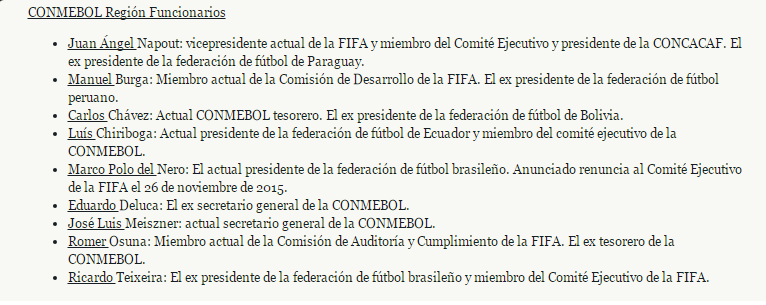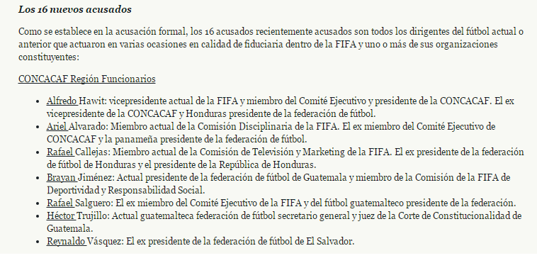 Entre los nuevos involucrados en el escándalo FIFA se encuentran presidentes de federaciones de América Central y América del Sur; entre las federaciones que resaltan en América del Sur se encuentran: Perú, Paraguay, Bolivia y Ecuador. Loretta Lynch agradeció la colaboración de las autoridades suizas y el FBI.